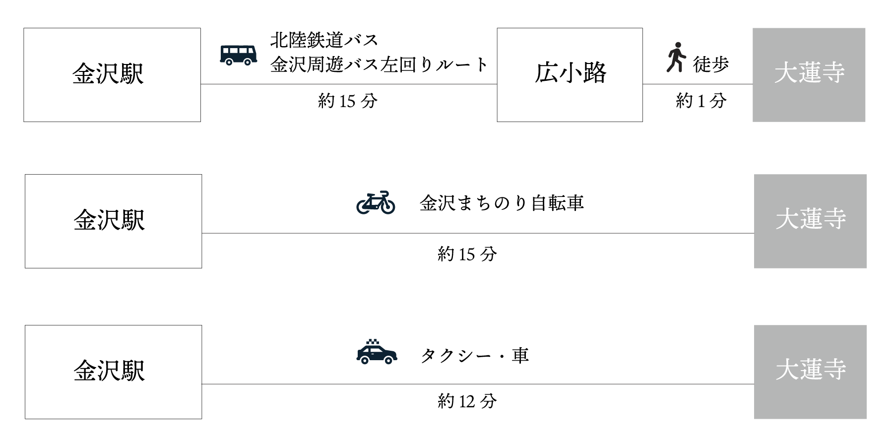 JR「金沢駅」東口バスターミナルで北陸鉄道バスに乗車 野町のバス停「広小路」で下車 徒歩で約1分 (周遊バスは金沢駅東口7番のりばで乗車)