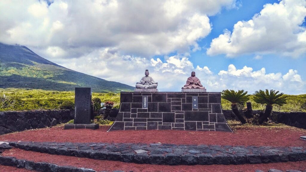 宇喜多秀家と豪姫の記念像は、八丈島の西岸、八重根港に近い船戸鼻にある溶岩流の黒い岩場が広がる、岩海が南原千畳岩(南原千畳敷)にあります。